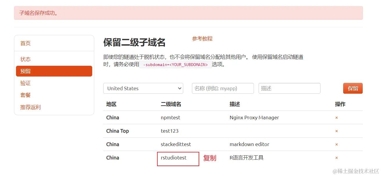 登录cpolar官网,点击左侧的预留,选择保留二级子域名,设置一个二级子域名名称,点击保留,保留成功后复制保留的二级子域名名称