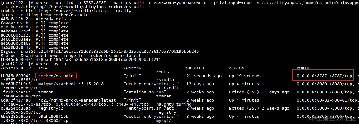 执行后,会自动下载镜像,然后启动容器,完成后,输入docker ps 即可看到运行的RStudio容器,运行挂载的端口为:8787,docker安装就完成了,非常简单快捷,且省去了繁琐的环境配置