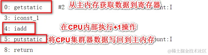 通过对这个程序的分析,可以查看出,++的操作,一共分为了三步,首先是线程从主内存拿到数据保存到CPU的寄存器中,然后在寄存器中进行+1操作,最终将结果写回到主内存当中。