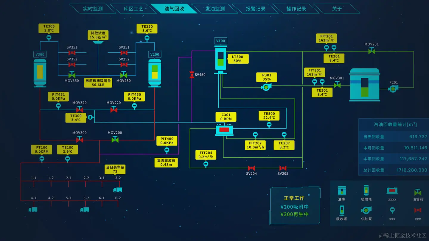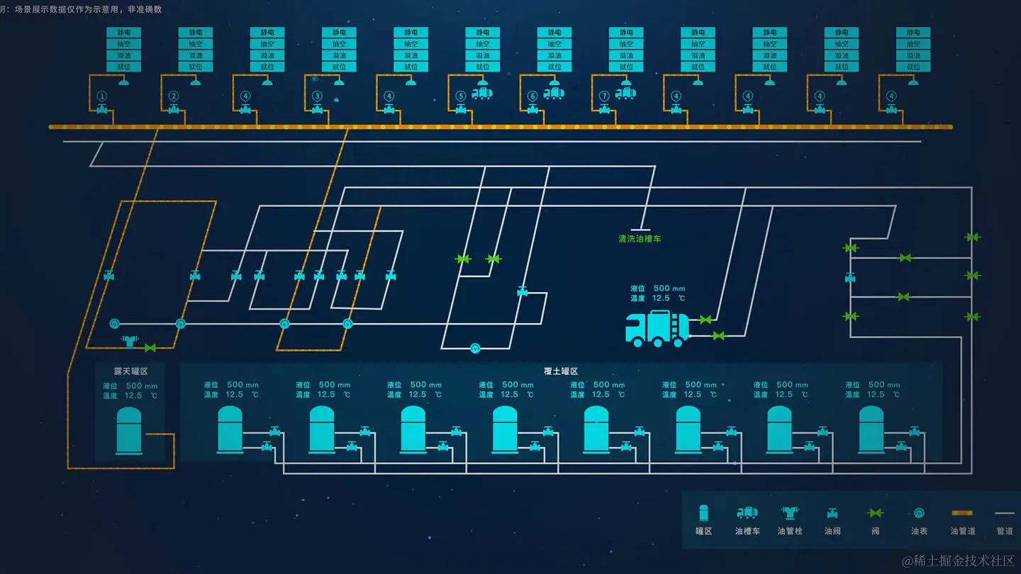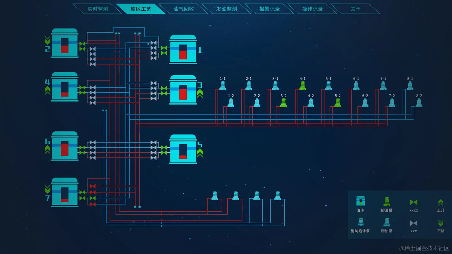 系统对进出油、管线输油和倒罐等作业进行监控,系统提供丰富的动画展示方式,包括位移、变色、闪烁、显隐等,直观显示作业进度、油品流动方向、泵阀状态等信息。