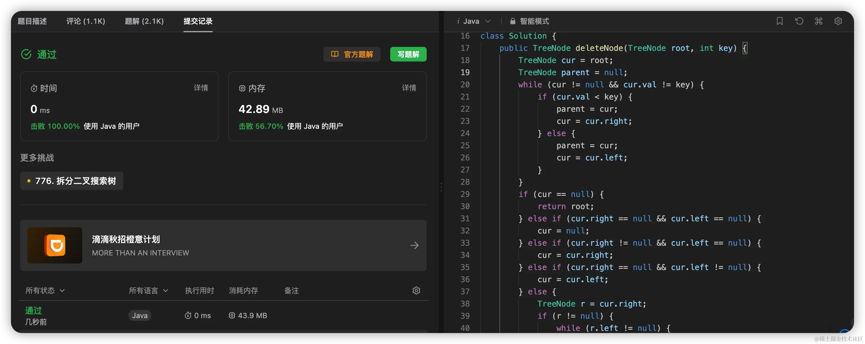 给定一个二叉搜索树的根节点 root 和一个值 key,删除二叉搜索树中的 key 对应的节点,并保证二叉搜索树的性质不变。返回二叉搜索树(有可能被更新)的根节点的引用。
