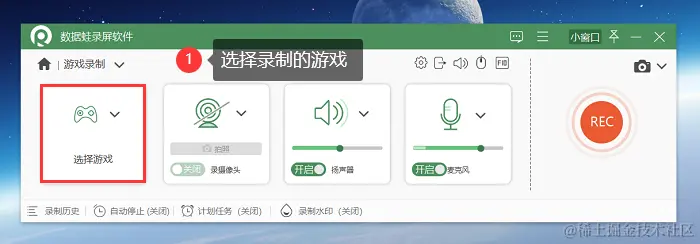 第2步:在 “游戏录制” 页面,选择我们需要录制的游戏窗口,根据需要对麦克风和扬声器进行调整。