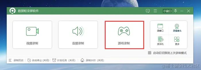 第1步:访问数据蛙录屏软件的官方网站,下载适用于Windows系统的安装包,并按照提示完成安装过程,打开在主界面中选择中间的 “游戏录制” 模式。