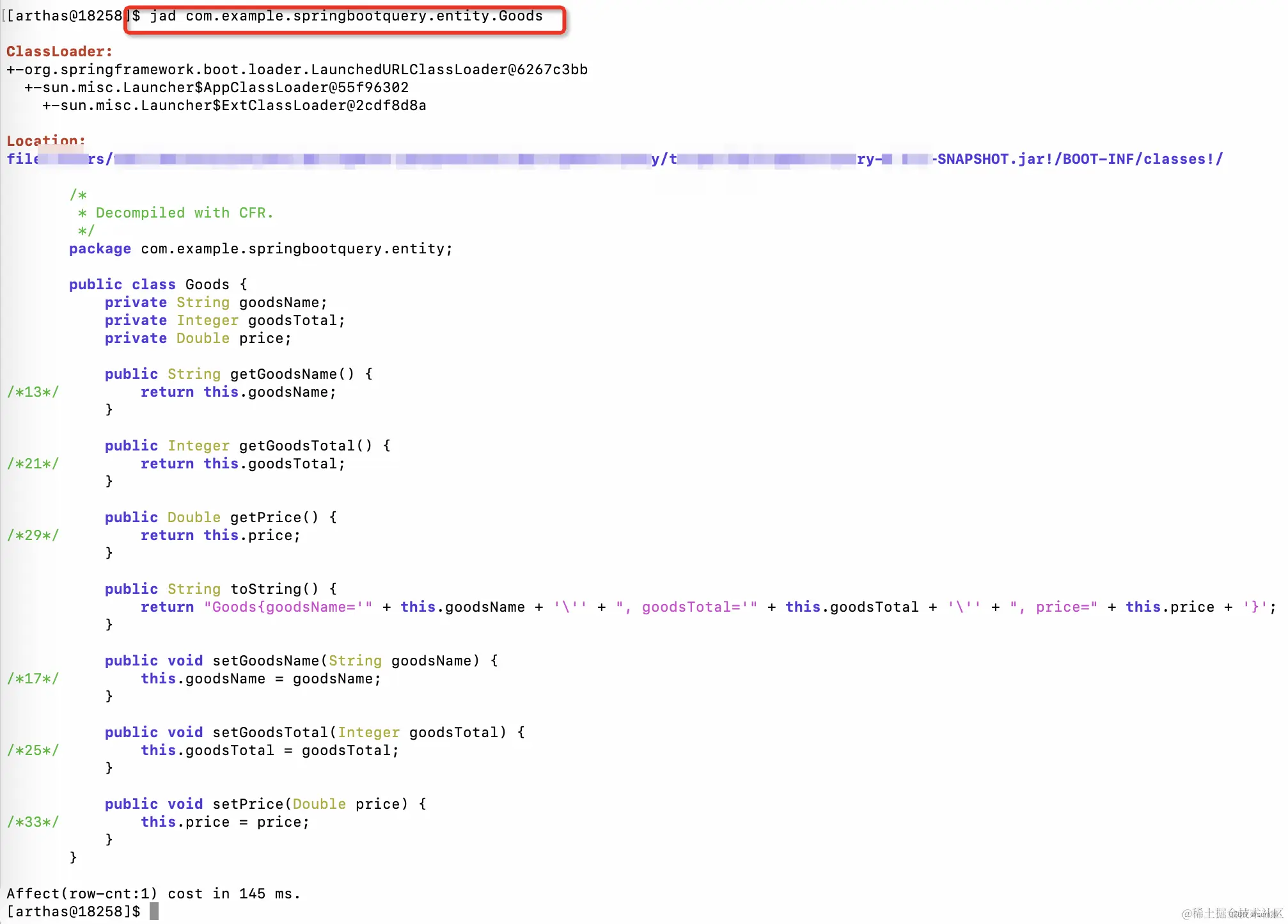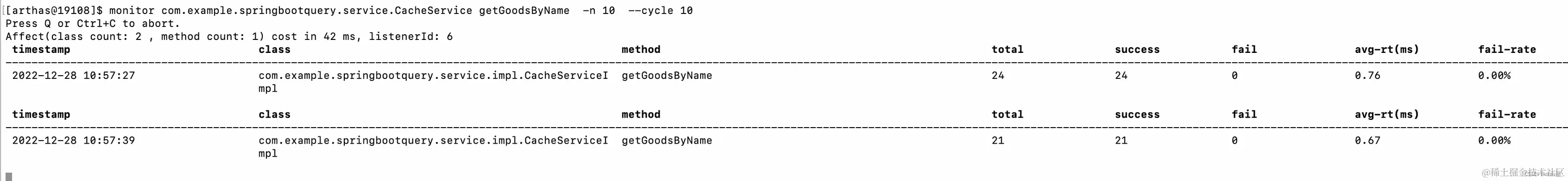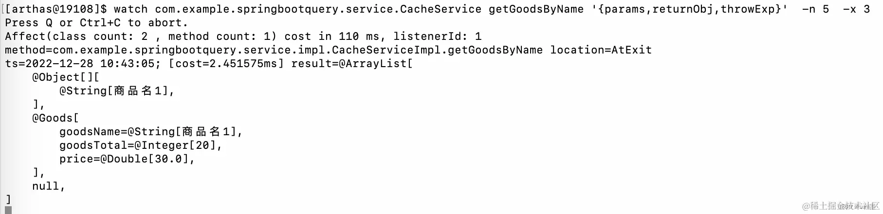这样就会生成一条监测命令,粘贴到刚才的arthes控制台即可,调用一下该方法,就可以看到出入参数了,非常的便捷好用。