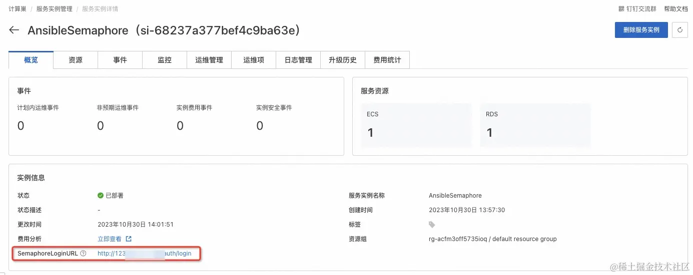 - 进入到对应的服务实例后,点击 SemaphoreLoginURL 后面的链接,输入账号为admin,密码为部署参数中设置的管理员密码。