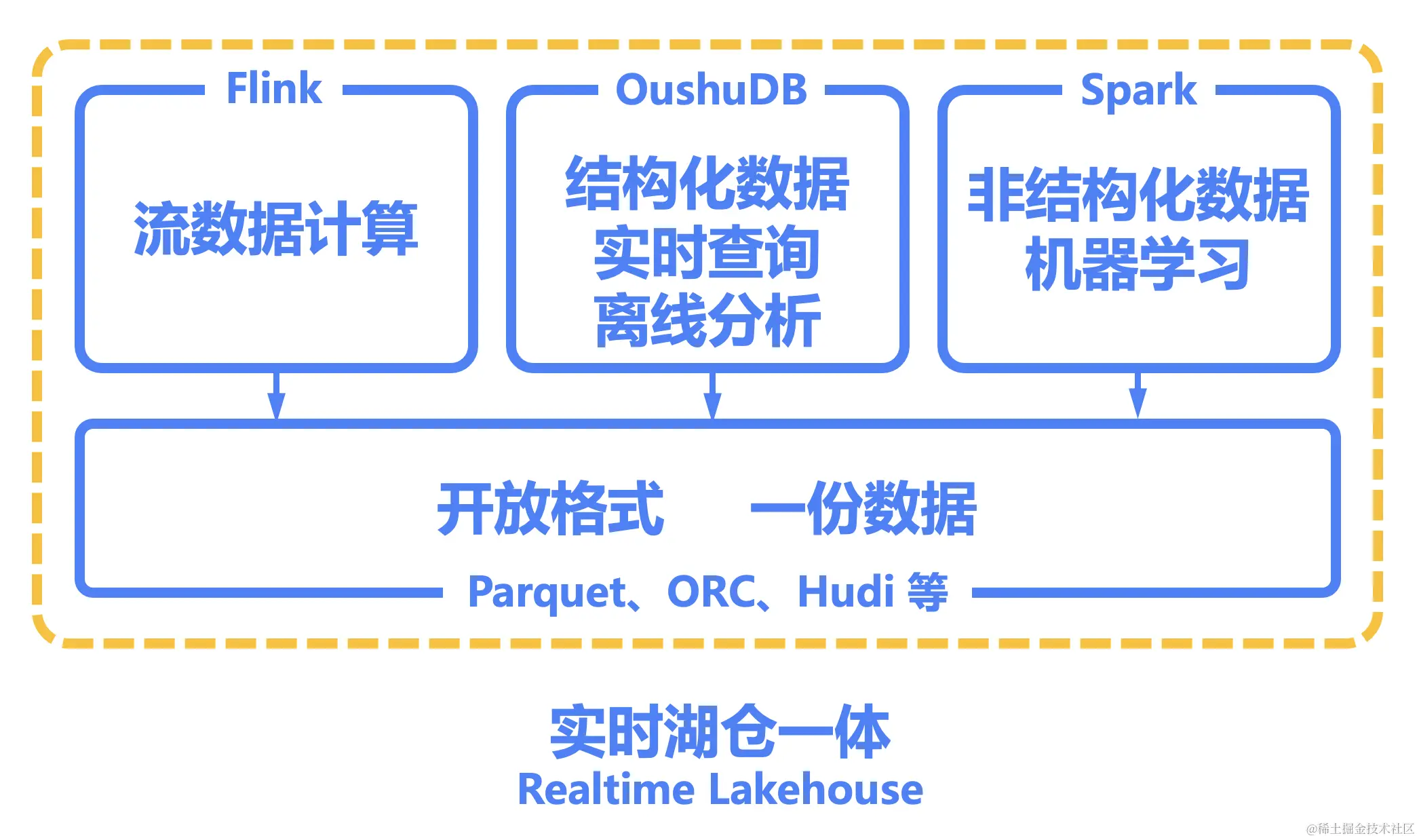 偶数给出的破局之道首先是在数据的存储方面采用开放格式的一份数据(如Parquet、ORC、Hudi等)。各个计算引擎都使用开放的数据格式,数据以开放文件格式被写入数据平台,之后就能被多个引擎多次直接读取和使用。