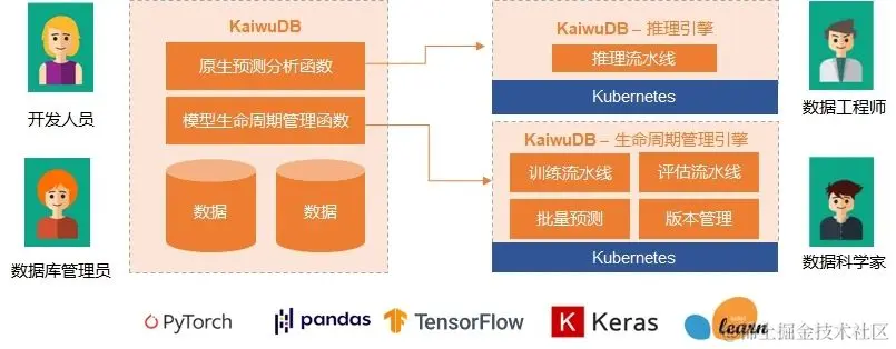 为此,KaiwuDB 提供了原生预测分析能力。我们希望提供一个平台,能够实现数据库和算法的紧密结合。比如,支持数据库中的函数调用平台上的模型训练、模型推理等能力。这样从数据库开发人员和管理人员的操作层面来看,他们相当于只在使用我们数据库的一个基本能力,并不会产生额外负担。另一方面,我们也可以为数据科学家开放接口,让他们能够把训练出来的模型,放进数据库中。通过上述方式,可以把各类数据库相关人员紧密联系起来。