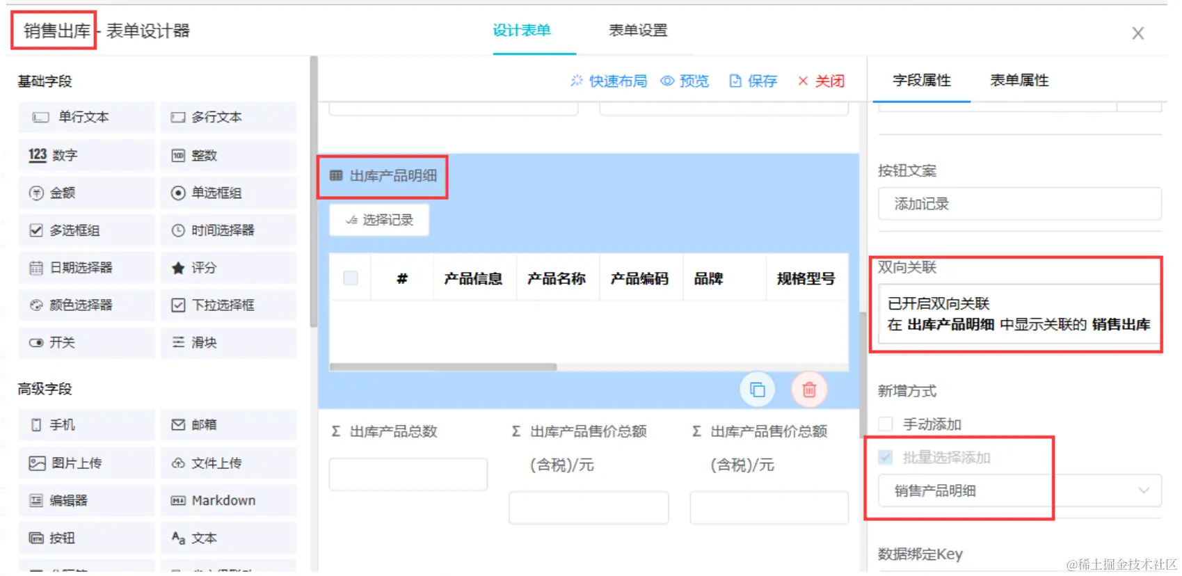 “销售出库”中配置子表“出库产品明细”,并设置为双向关联。 勾选“批量选择添加”,选择“销售采购明细”。如果没有“销售采购明细”可选择,请参考3.4配置。