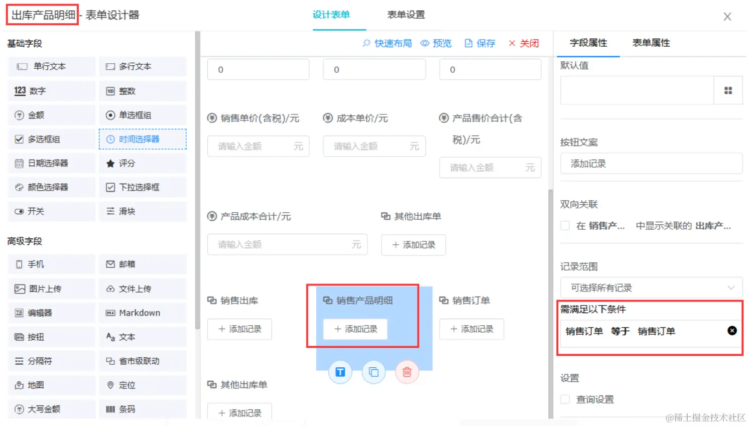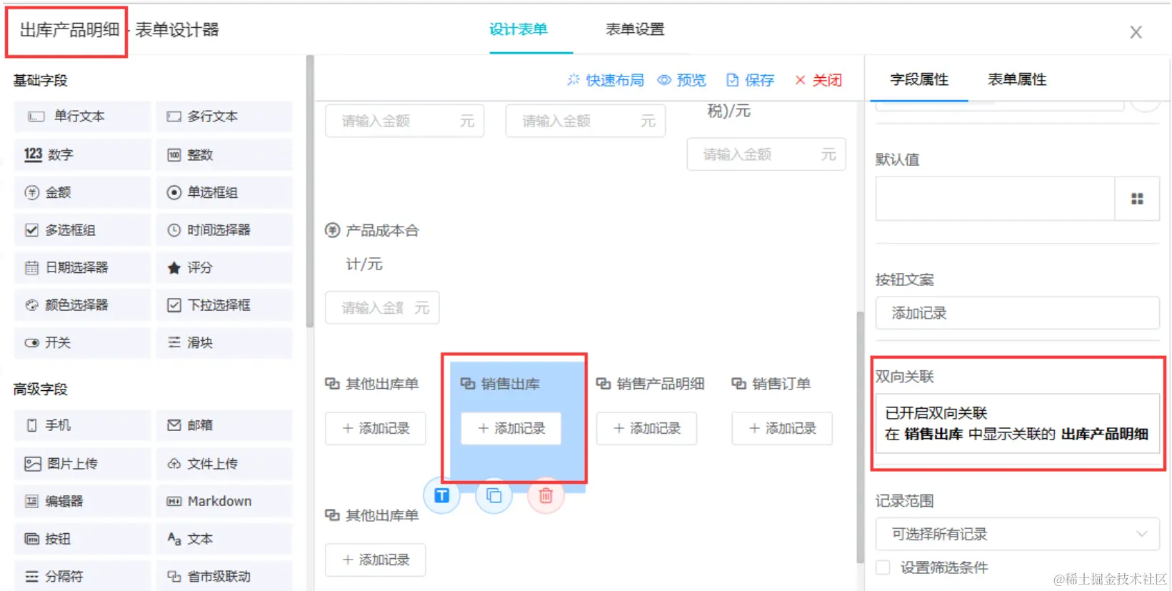 “出库产品明细”中配置关联记录,关联“销售产品明细”,并设置筛选条件