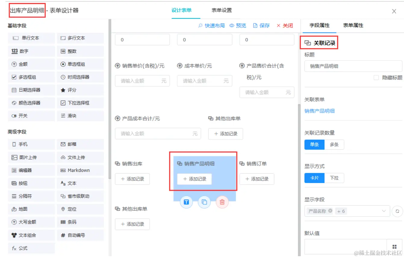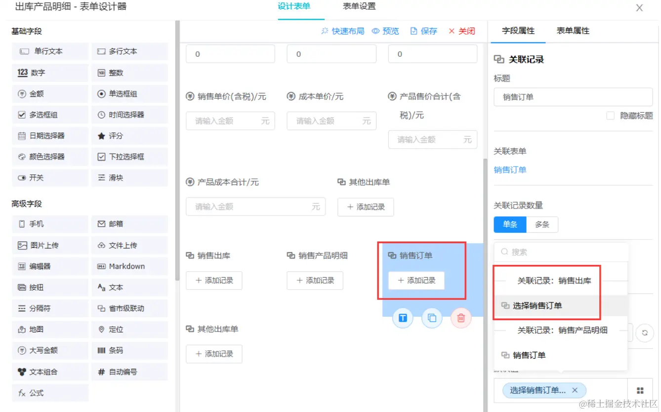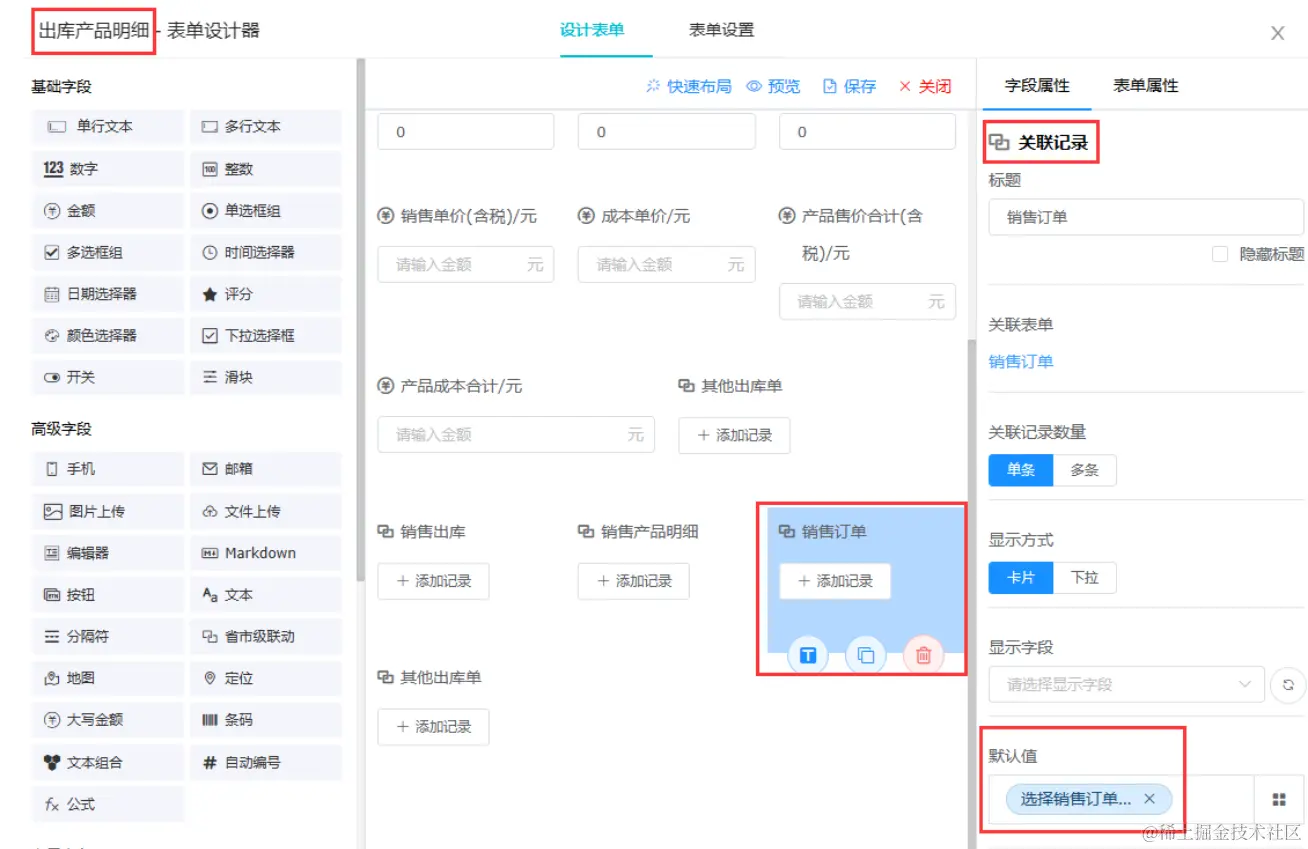 “出库产品明细”中配置关联记录,关联“销售订单”,并设置默认值为“销售出库”中的“选择销售订单”