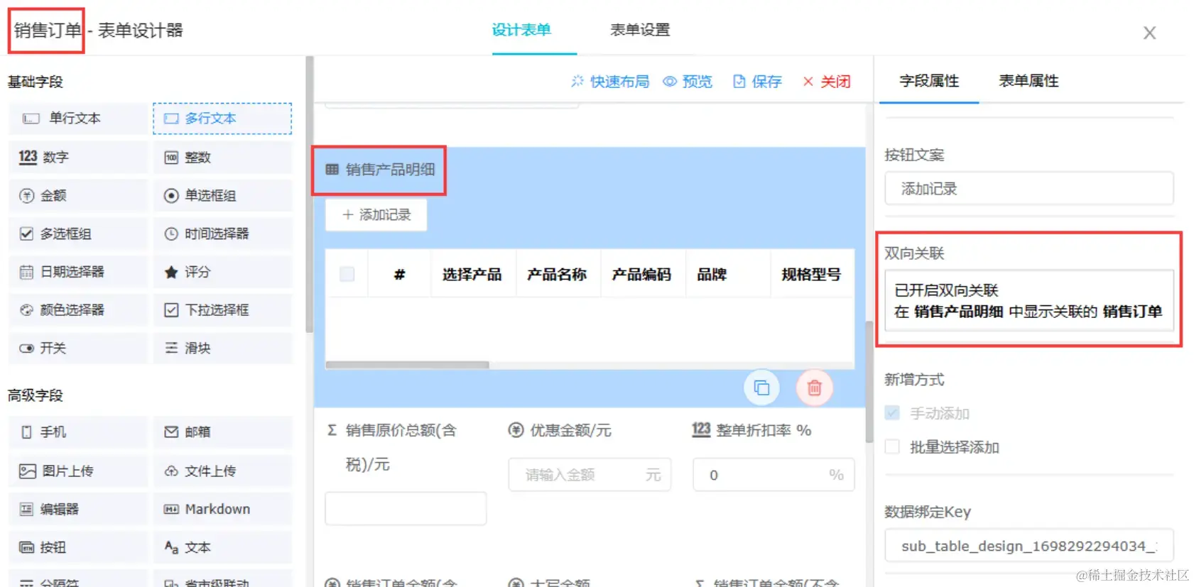 “销售订单”中配置子表“销售产品明细”,并设置为双向关联。