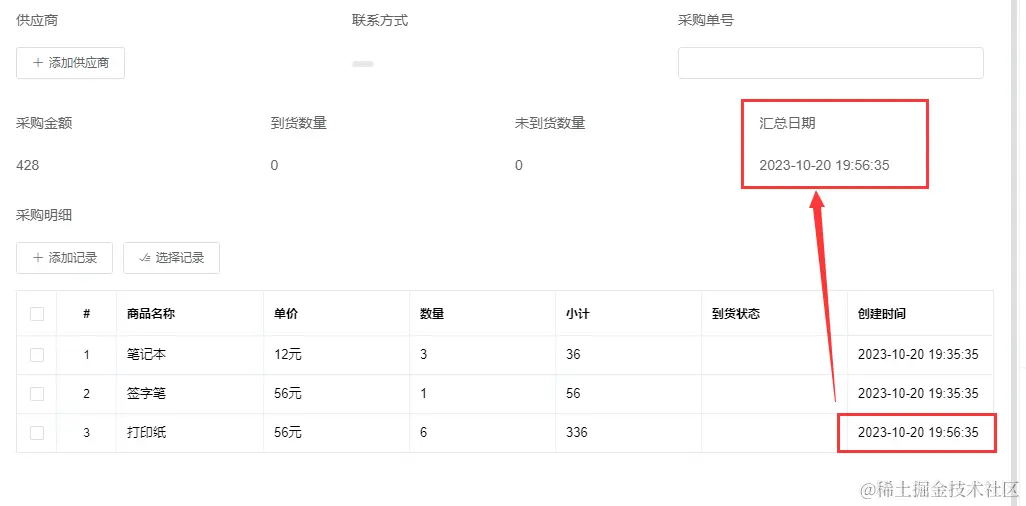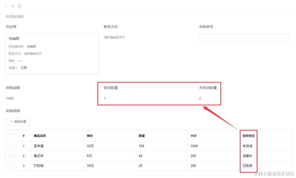 例如在采购单中,我们需要统计未到货数量即“未发货”和“运输中”的商品;已到货数量即“已到货”的商品数量。如下图:
