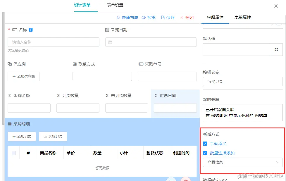 “子表控件”拖拽至表单设计区域,必须为“将已有工作表作为子表” - 子表中必须有关联记录字段,例如:采购明细中的