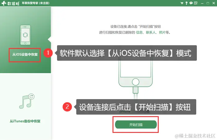 步骤2:根据提示用数据线连接您的iPhone和电脑,选择【从iOS设备中恢复】模式,当出现【设备已连接】的字样时,请点击【开始扫描】按钮。