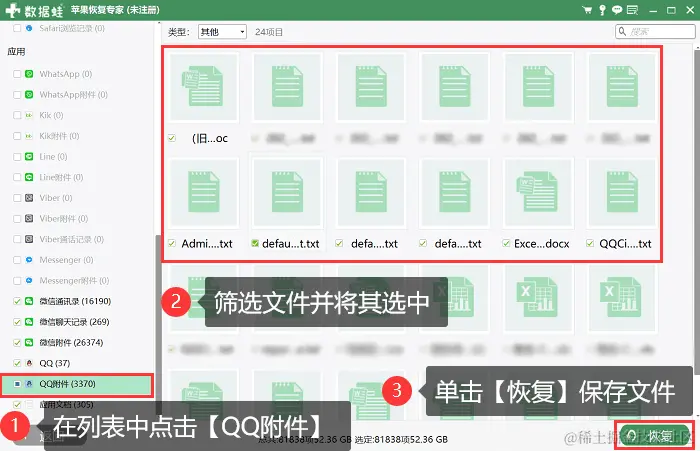 步骤3:数据扫描结束后可以先在左上角取消全选,然后在左侧列表栏中拉到最底部找到【QQ附件】,筛选完毕后将想要恢复的文件进行勾选,最后点击【恢复】即可。