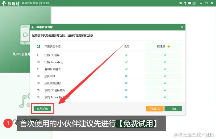 步骤1:在电脑上安装该软件,并将其存放在空间充足的磁盘中,以免因为磁盘内存不足而导致扫描失败。安装完成后打开软件,然后选择【免费试用】。