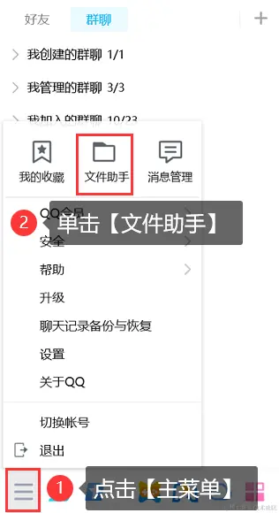 步骤2:点击QQ页面左下角的【三横线】图标,在弹出的界面中单击【文件助手】。