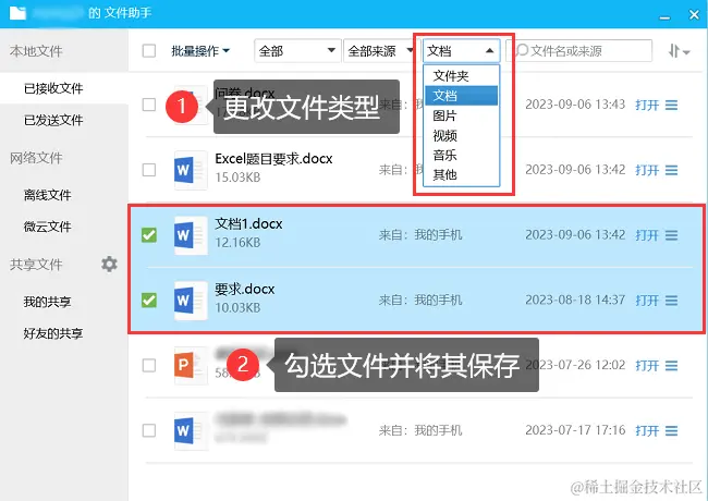 步骤3:进入文件助手页面后,在【已接收文件】中将文件类型更改为【文档】即可查看到接收过的QQ文件。