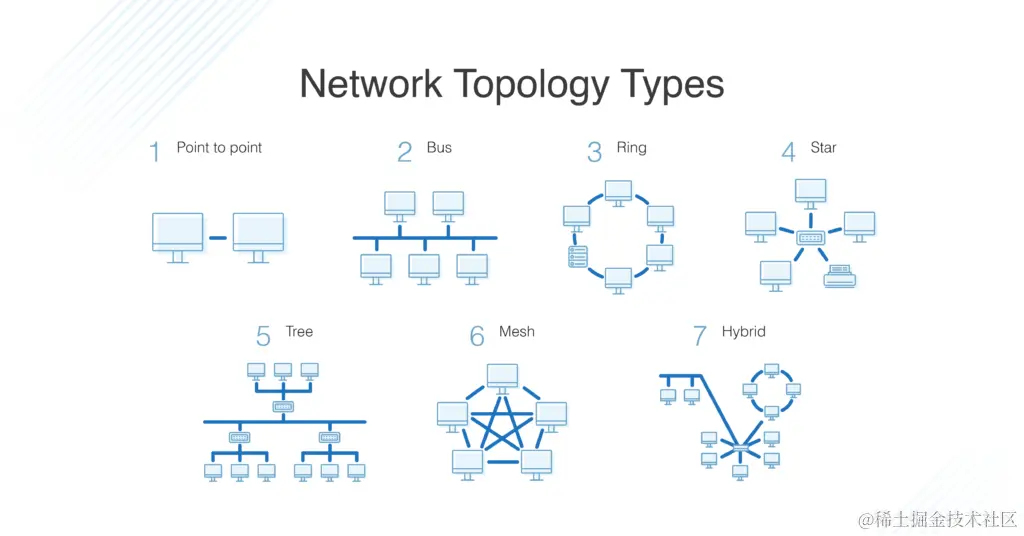 拓扑(topology)描述的是节点和链路如何在网络配置中组合在一起,通常用图描述。这里是一些常见的网络拓扑类型: