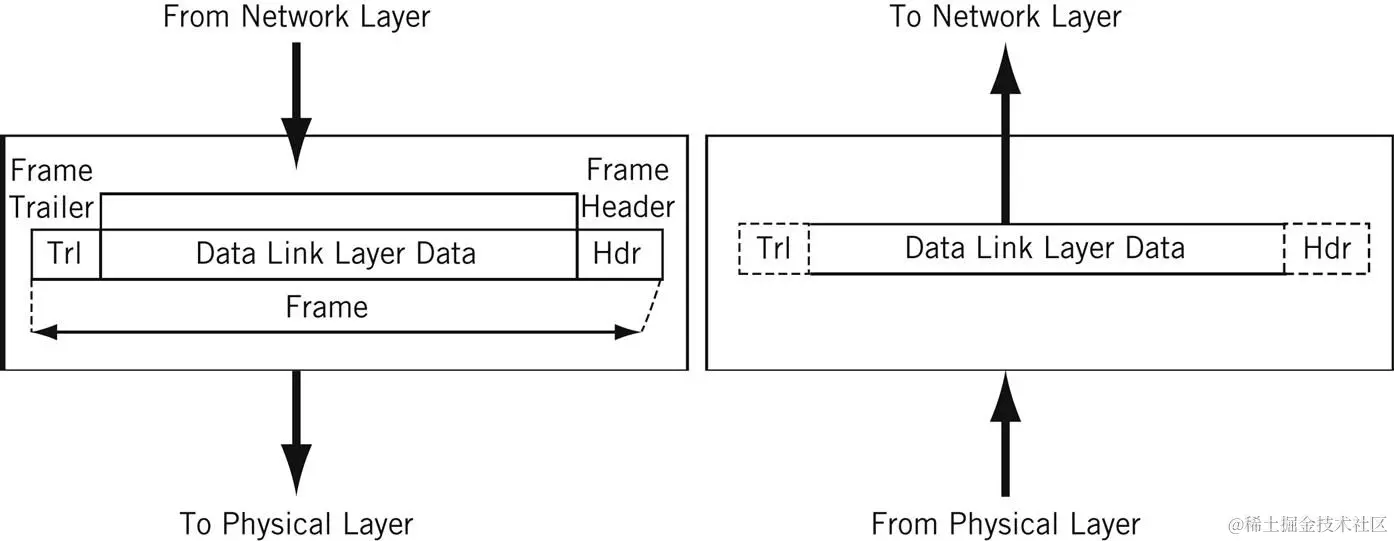- 帧尾:包括错误检测信息。当检测到错误时,根据实现或网络的配置或协议,帧可能被丢弃,或者错误会被报告给上面的层,用于进一步错误校正。例如,错误检测机制的有循环冗余校验(CRC,Cyclic Redundancy Check)和帧校验序列(FCS,Frame Check Sequence)。