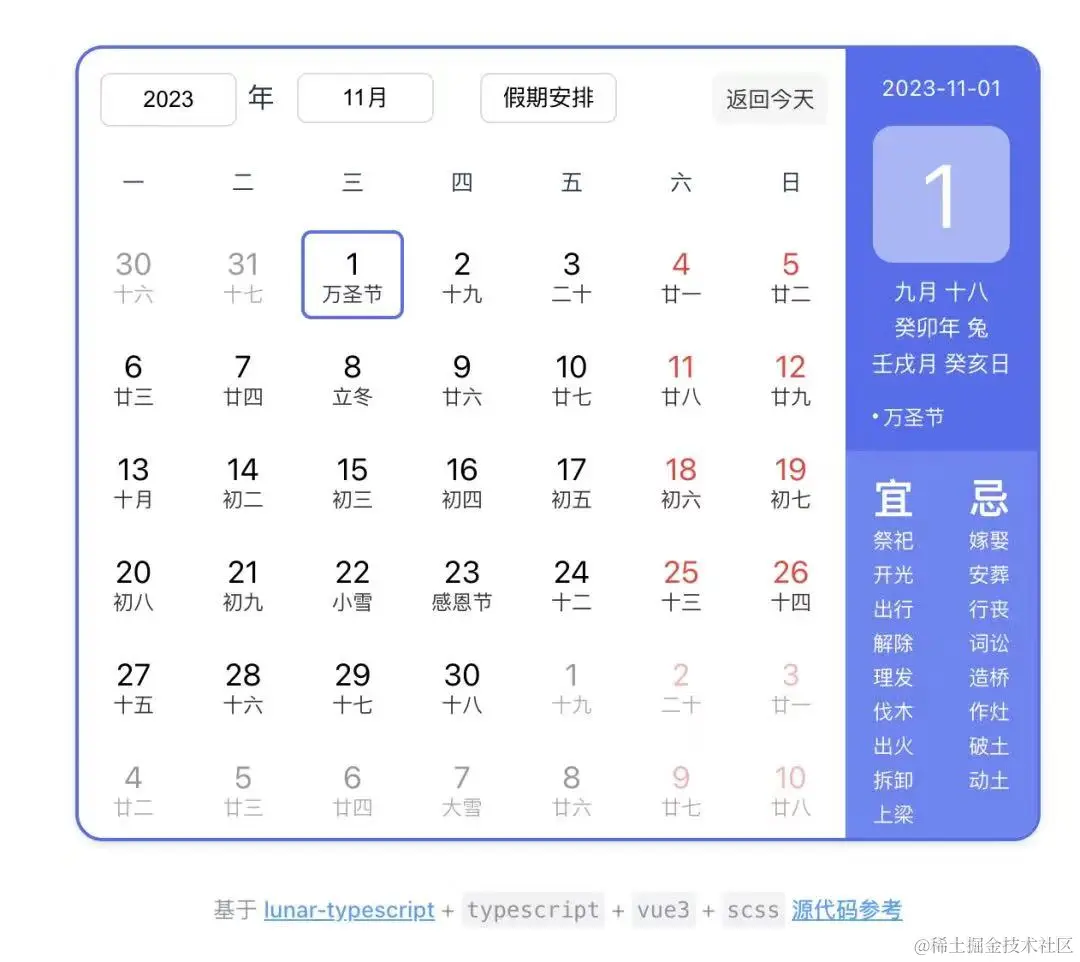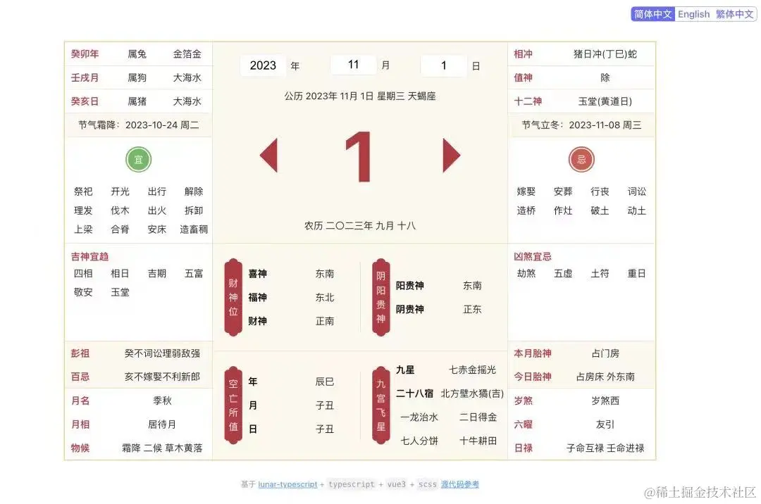 日常GitHub划水发现一款超级6的日历工具库lunar,它支持阳历、阴历、佛历和道历,甚至还玩上了星座、干支、生肖、节气、节日、彭祖百忌、每日宜忌、吉神宜趋、凶煞宜忌、吉神方位、冲煞、纳音、星宿、八字、五行、十神、建除十二值星、青龙名堂等十二神、黄道日及吉凶等。大多数日历需求使用它都能满足。