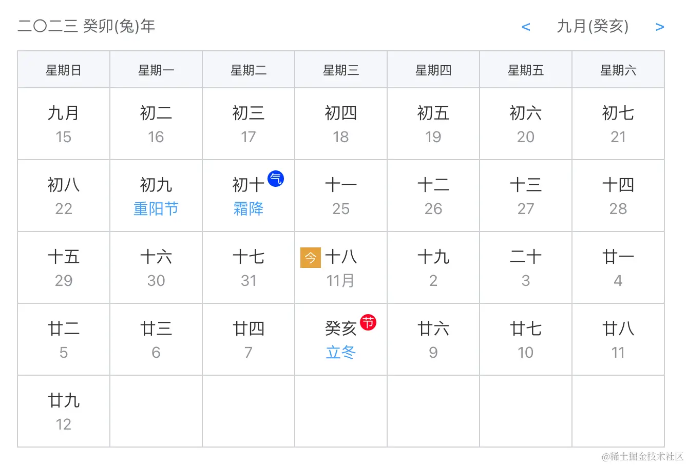 lunar仅提供了API,并没有提供现成直接用的日历组件。 比如,阳历获取年月日、儒略日、星期、是否闰年、节日、星座、日期推移、日期相减、日期比较、薪资比例、转阴历。