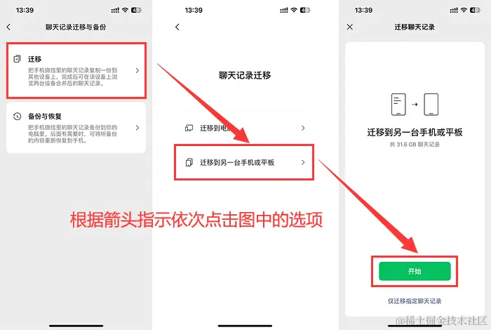 步骤3:在聊天记录迁移页面,选择【迁移到另一台手机或平板】选项,然后点击【开始】即可将全部聊天记录导出到另一台手机。