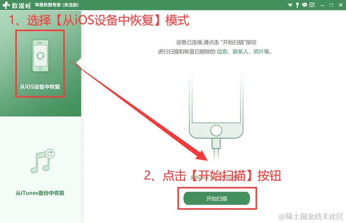 步骤2:打开软件后会提示您要用数据线连接手机和电脑,连接完成后选择【从iOS设备中恢复】并点击【开始扫描】。