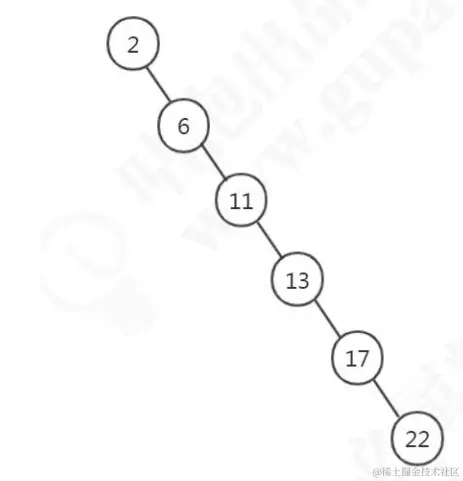 还是刚才的这一批数字,如果我们插入的数据刚好是有序的,2、6、11、13、17、22。这个时候我们的二叉查找树变成了什么样了呢?
