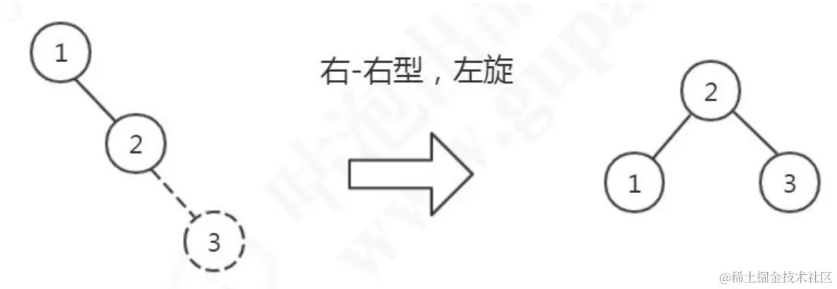 我们注意看:当我们插入了 1、2 之后,如果按照二叉查找树的定义,3 肯定是要在2 的右边的,这个时候根节点 1 的右节点深度会变成 2,但是左节点的深度是 0,因为它没有子节点,所以就会违反平衡二叉树的定义。 那应该怎么办呢?因为它是右节点下面接一个右节点,右-右型,所以这个时候我们要把 2 提上去,这个操作叫做左旋。