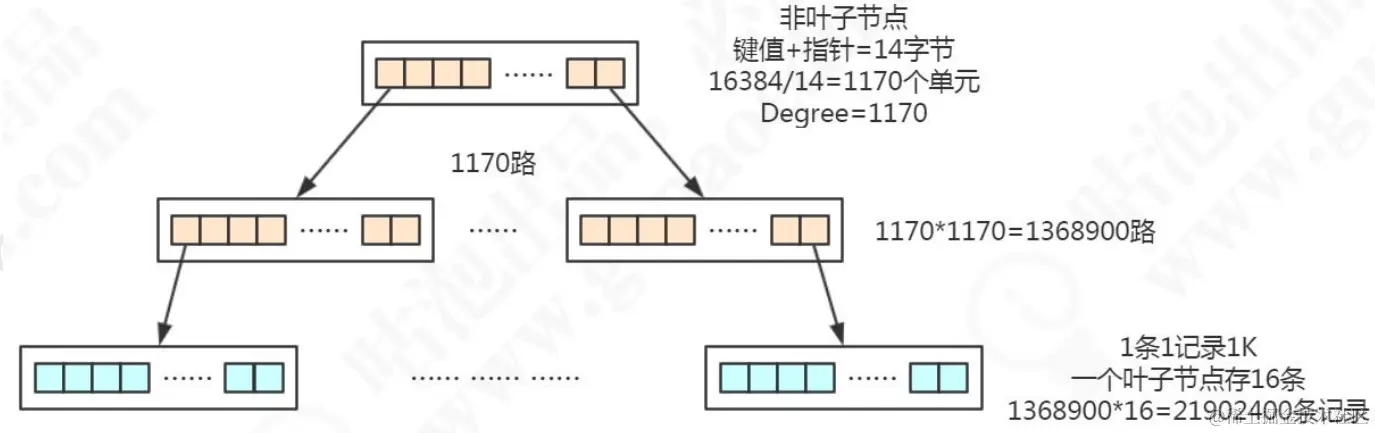 假设索引字段是 bigint 类型,长度为 8 字节。指针大小在 InnoDB 源码中设置为6 字节,这样一共 14 字节。非叶子节点(一页)可以存储 16384/14=1170 个这样的单元(键值+指针),代表有 1170 个指针。树 深 度 为 2 的 时 候 , 有 1170^2 个 叶 子 节 点 , 可 以 存 储 的 数 据 为1170117016=21902400。