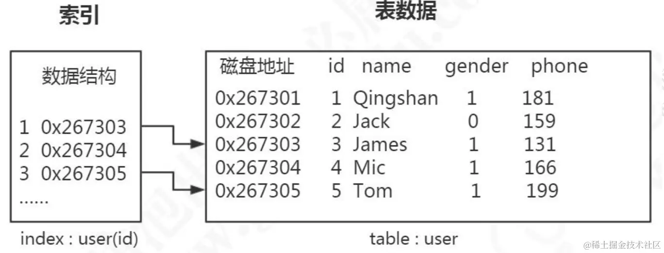 但是有了索引之后,只需要在索引里面去检索这条数据就行了,因为它是一种特殊的专门用来快速检索的数据结构,我们找到数据存放的磁盘地址以后,就可以拿到数据了。