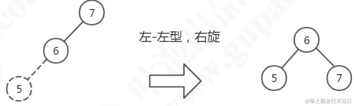 同样的,如果我们插入 7、6、5,这个时候会变成左左型,就会发生右旋操作,把 6提上去。