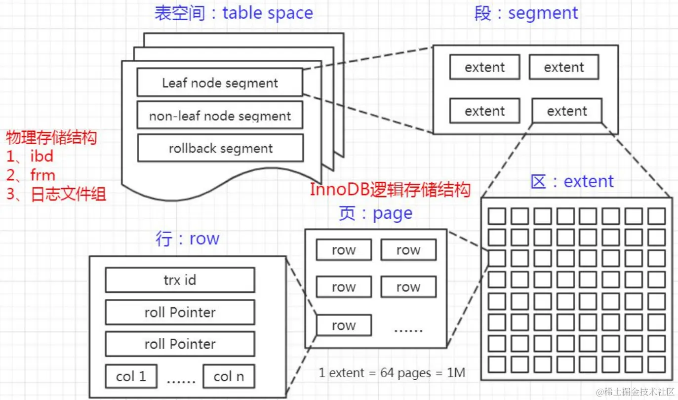 一个段(Segment)又由很多的簇(也可以叫区)组成,每个区的大小是 1MB(64个连续的页)。
