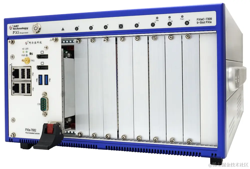 在此以一个高度为3U的9槽PXIe系统为例。系统控制器,也就是CPU模块,位于机箱的左边第.一.槽,其左方预留了三个扩充槽位给系统控制器使用,以便插入因功能复杂而体积较大的系统卡。由第.二.槽开始至第八槽称为外设槽,可以让用户依照本身的需求而插上不同的仪器模块。其中第.二.槽又可称为星形触发控制器槽。