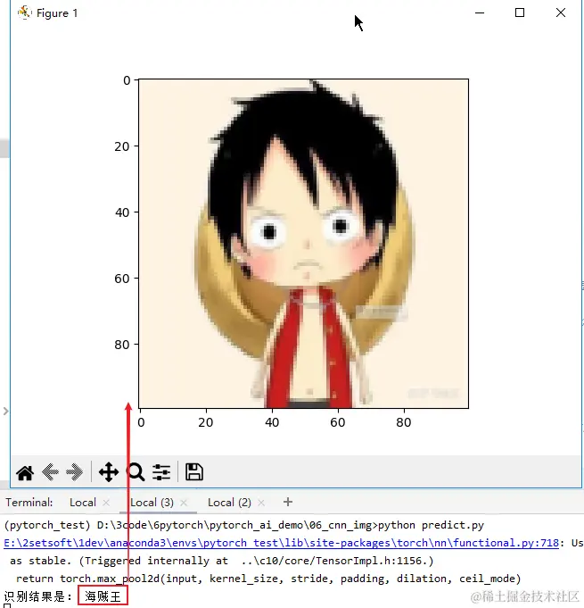 训练完成保存参数到本地,下面就是将加载进的参数来测试其他图片的分类效果,同样的也是将指定图片和训练时一样的转换操作,最后将预测结果取出最大分布索引值,根据索引就可以匹配出分类名称了。另一个是工具函数,将 tensor 格式的图片在预测结果后显示在 pyplot 中。