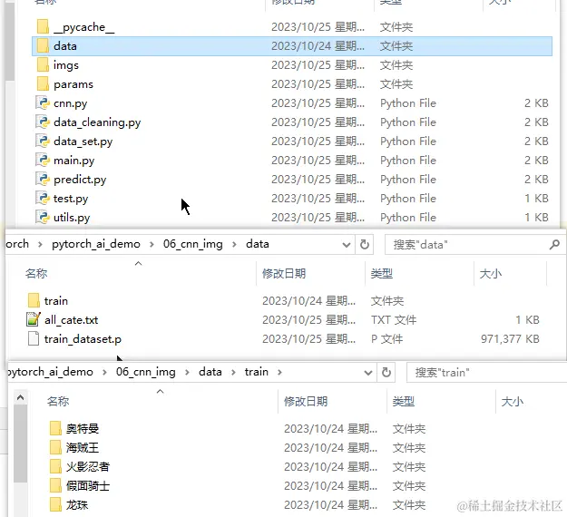 写代码前已经把需要的图片做好了分类,上面的依赖包也已经安装完毕。由于只是演示这里没有用预训练模型(ResNet、VGG),因为训练时要用的是 Tensor,所以需要先读取文件夹内的图片先转化为 PIL 的对象数据或 Numpy 数据,然后可以对图片进行调整,最后全都转成 Tensor(也可以跳过 PIL 直接转张量)。这里需要注意的是对灰彩图片通道,不同尺寸图的统一处理,就是灰色图的单通道要通过复制的方式创建三个通道,所以图片设置一样的像素大小。因为在卷积网络中,输入的通道数和输入大小要一致,不然可能在训练中报错。