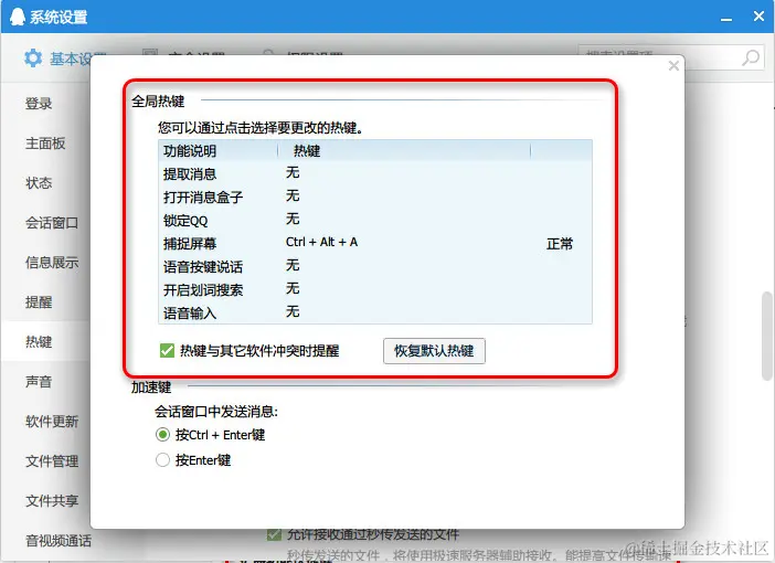 - 如上图红色圈住内容所示,QQ 这些快捷键也很容易跟 IntelliJ IDEA 快捷键冲突,需要全部去掉,最多保持一个截图功能即可。