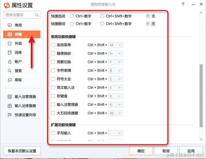 由于文化的不同,我们使用的电脑必备一个软件就是中文输入法,而目前大多数人都使用搜狗拼音输入法或是其他类似的。而这些输入法跟 IntelliJ IDEA 有一个万恶的冲突永恒不变:快捷键冲突。所以为了配合 IntelliJ IDEA,我们要去掉这些输入法下的所有快捷键。