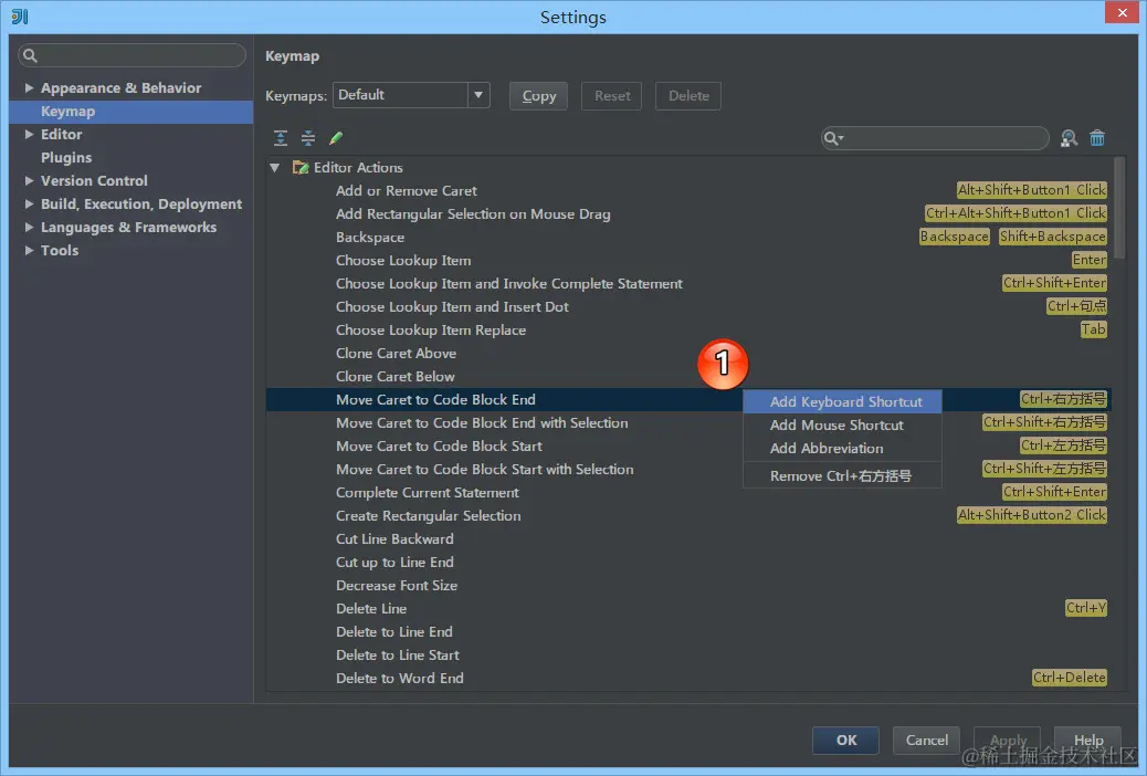 Ctrl + Alt + S 弹出 IDE 设置,如上图选择左侧的 Keymap。