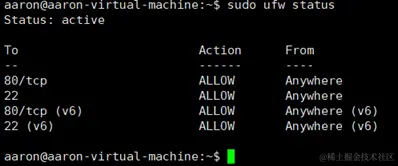sudo ufw status //查看防火墙的状态,如果防火墙是关闭状态则显示“Status: inactive”不活动,如果防火墙开启状态则显示当前设置的规则。