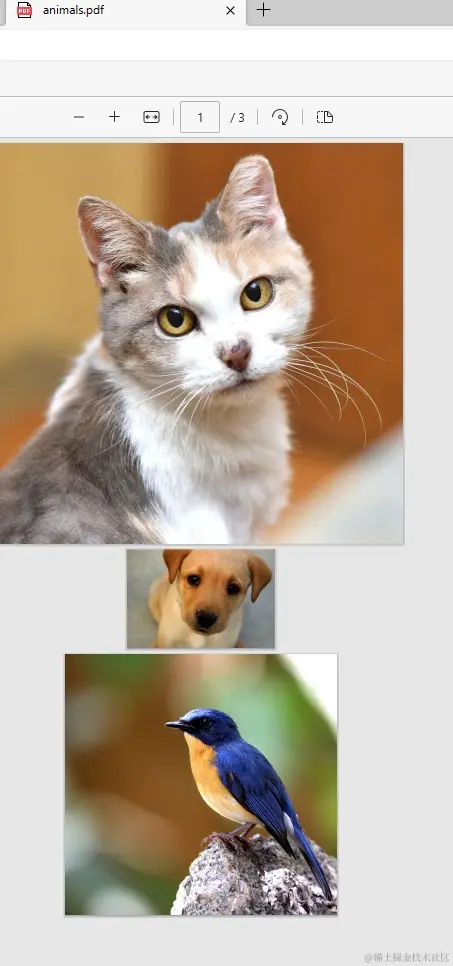 运行这段代码后,你就会在当前目录下看到一个名为 animals.pdf 的文件。打开它,你就会看到三张图像按照顺序排列在不同的页面上。