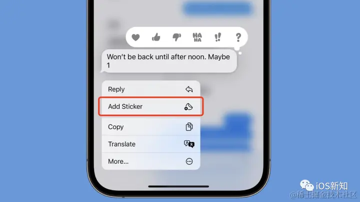 在消息应用里,可以长按某条“信息”,来添加一个贴纸响应,点击“添加贴纸”可让选择要添加的贴纸或表情符号。