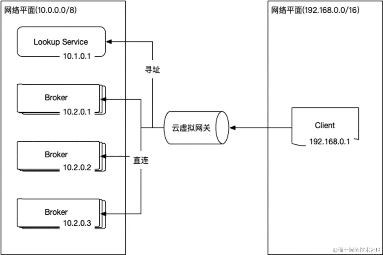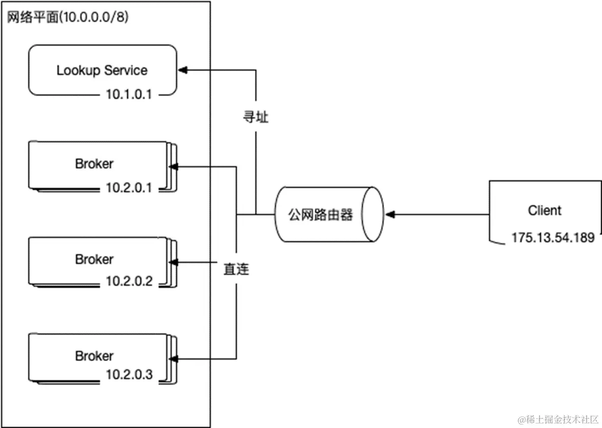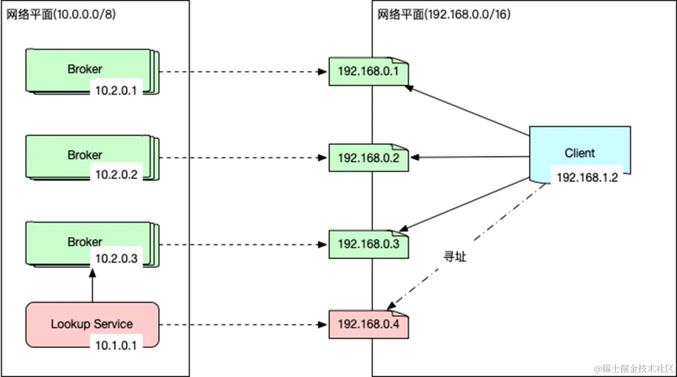 如图所示,Broker 部署在10.0.0.0/8,而 Client 在192.168.0.0/16,那么这时候,Client 想要访问 Broker 就变得不可能。