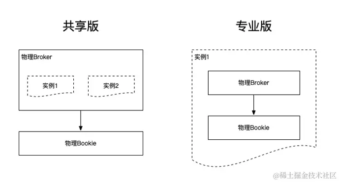 ● 共享版:Bookie 和 Broker 都是共享的,本质和一个公司自建一个集群给公司内所有业务团队共用是一个模型,共享版下的一个实例对应 Pulsar 的一个租户。