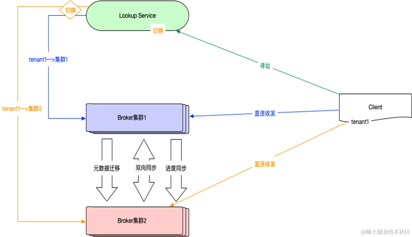 跨集群迁移特指一个租户从物理集群1迁移到物理集群2,两个集群同时提供服务,在线热切换,Client 轻微感知。