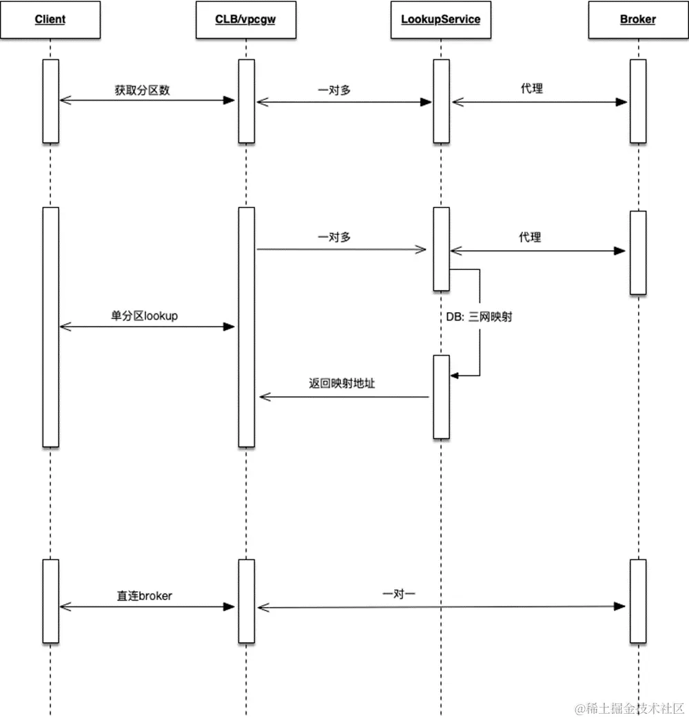 ● 第一步:获取 Topic 分区数:Client→CLB→Broker,一对多指的是该请求落到 CLB 后面的任意一台 Broker 都能对等返回正确结果。