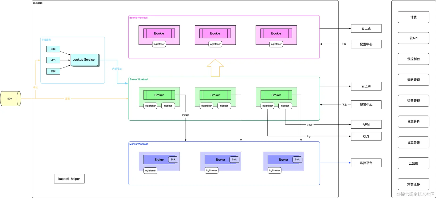 ● 完全容器化:包括 ZK、BK、Broker 以及其他周边设施,全部部署在容器平台上。