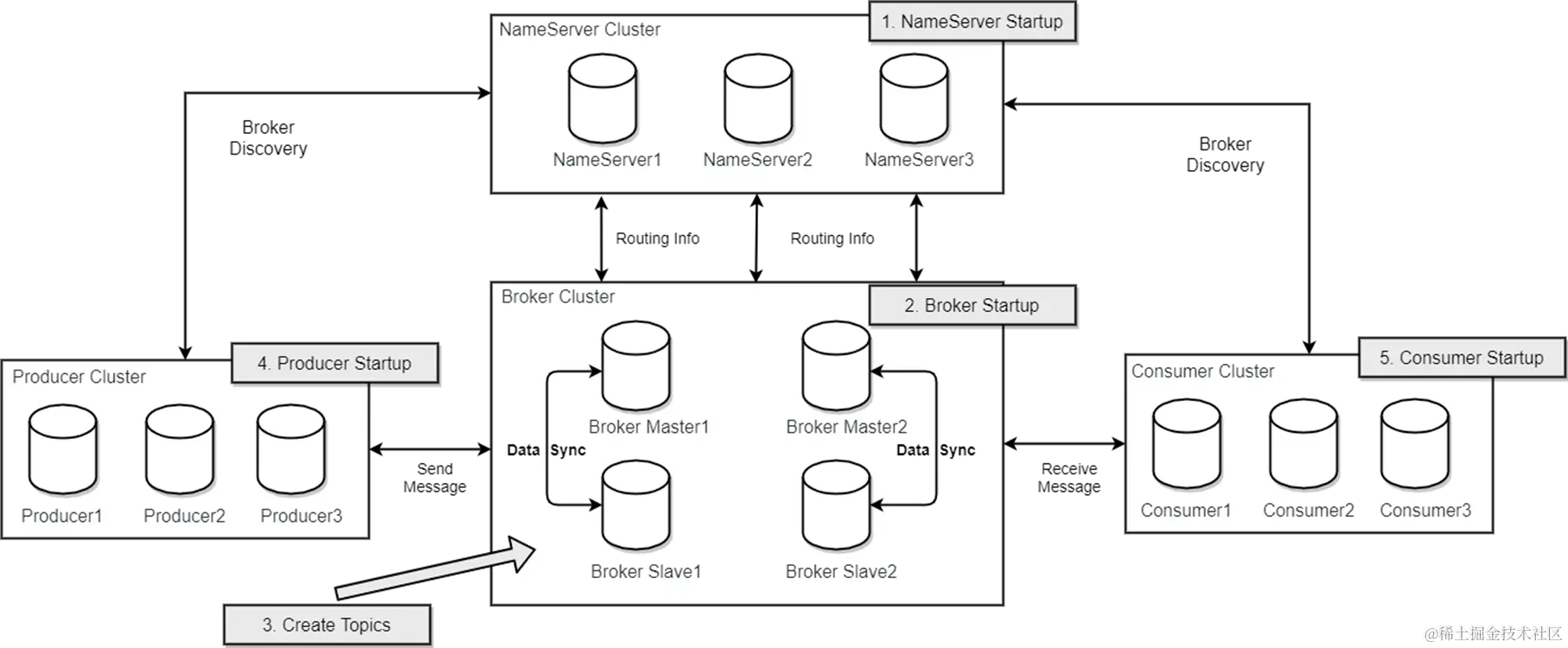 ● NameServer 保存了集群的元数据:Topic 和 Broker 之间的归属关系,这样就可以动态地配置 Topic 和 Broker 之间的从属关系,也可以将 Topic 在不同的 Broker 集群之间调度。