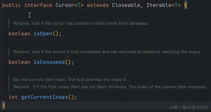 Closeable,Iterable接口,所以游标是可关闭、可遍历的。包含三个方法: